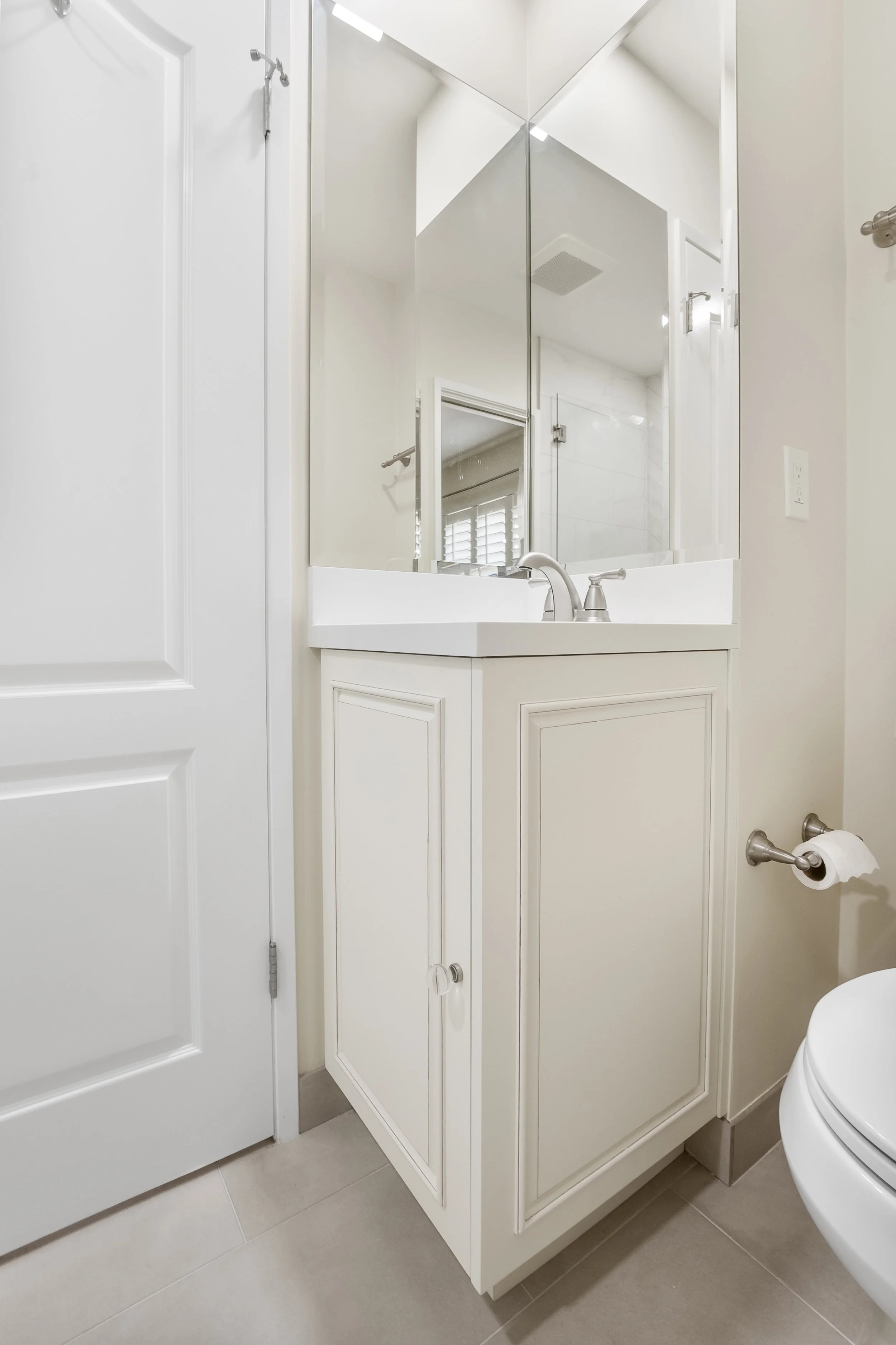 This remodel includes two bathrooms, both blending contemporary style and utility. Each features custom-built vanities for style and storage, beautiful tile work in the showers, durable brushed nickel fixtures, and glass enclosures for an airy feel.